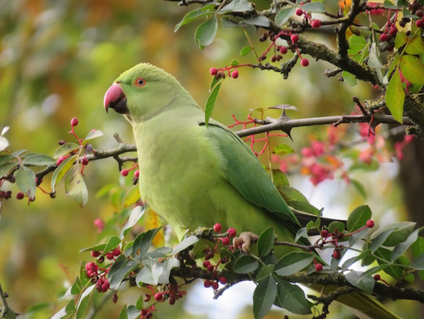 Perruche à collier se délectant de fruits de poivre du Sichuan au parc floral, 12e.