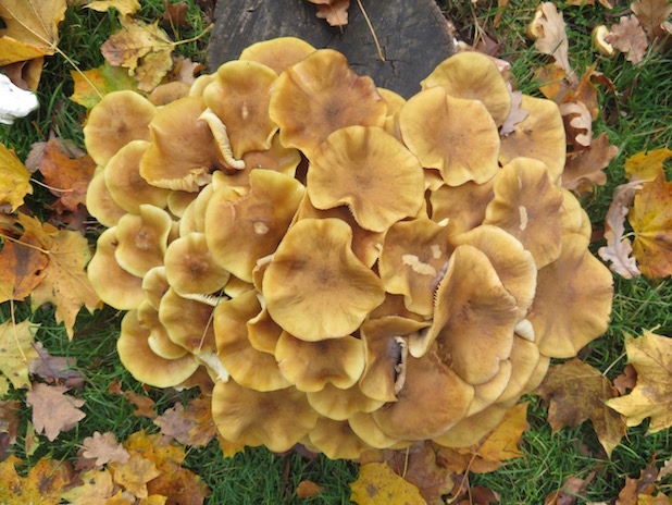 Belle touffe d’armillaire couleur de miel, armillaria mellea, sur une souche au parc floral, 12e.