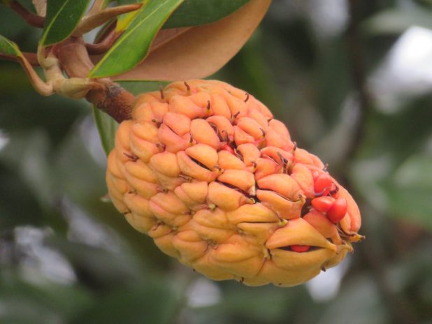 Fruit de Magnolia grandiflora laissant s’échapper des graines, à l’arboretum de la Vallée aux Loups, 92.