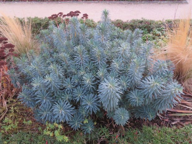 Belle touffe d’Euphorbia characias ‘ wulfenii ‘, dans le square Léon Serpollet, à Montmartre, 18e.