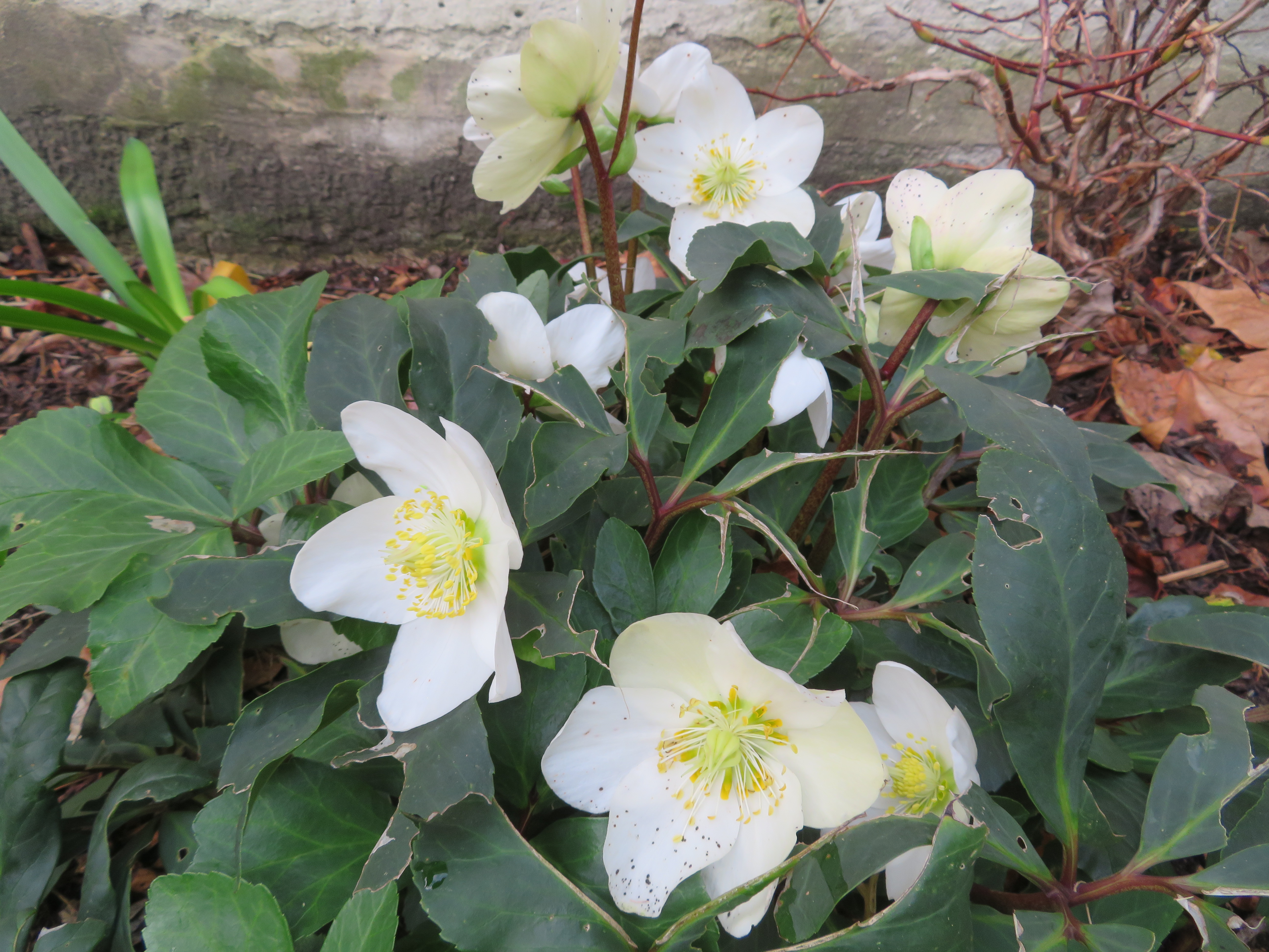 Rose de Noël, Helleborus niger, dans le jardin de l’hôtel d’Assy, quartier du Marais, 3e.