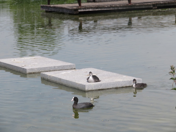 Poule d’eau couvant sur » la Mahonne « , oeuvre de jean Amado, sur le lac du Parc floral, 12e.