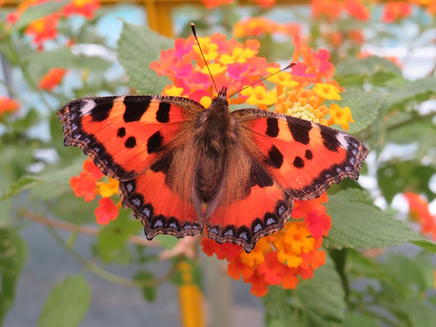 Petite tortue sur lantana, dans le pavillon des papillons au Parc floral, 12e.