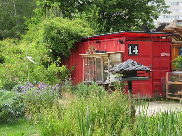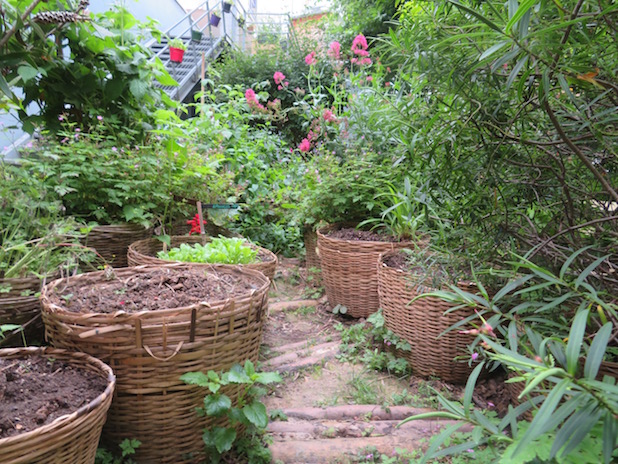 Paniers venus d’Afrique recyclés dans le jardin partagé l’Univert, quartier de la Goutte d’Or, 18e.