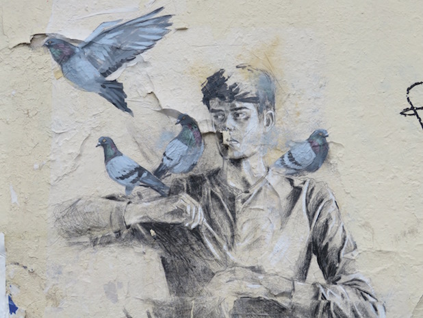Jeune homme aux pigeons au pied de l’église de Ménilmontant, 20e.