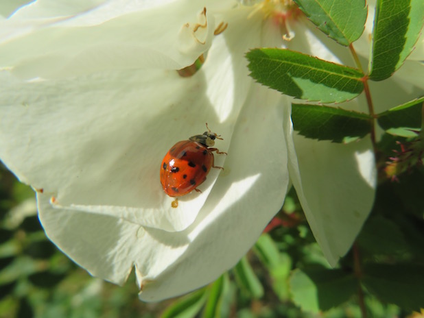 Coccinelle asiatique sur pétale d’églantine, au parc de Bagatelle, 16e.