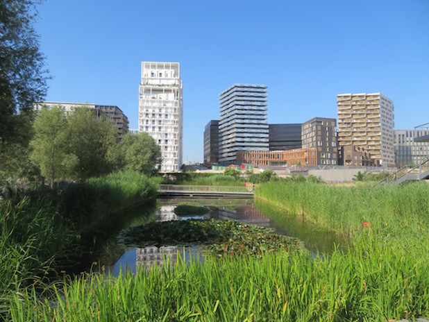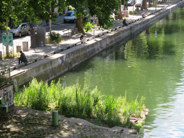 Radeau flottant végétalisé récemment installé sur le canal st Martin, 10e.