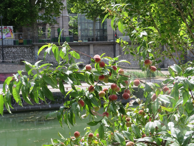 Pêcher chargé de fruits dans le » jardin afghan » créé par la » Guerilla gardening « , près du canal st Martin, 10e.