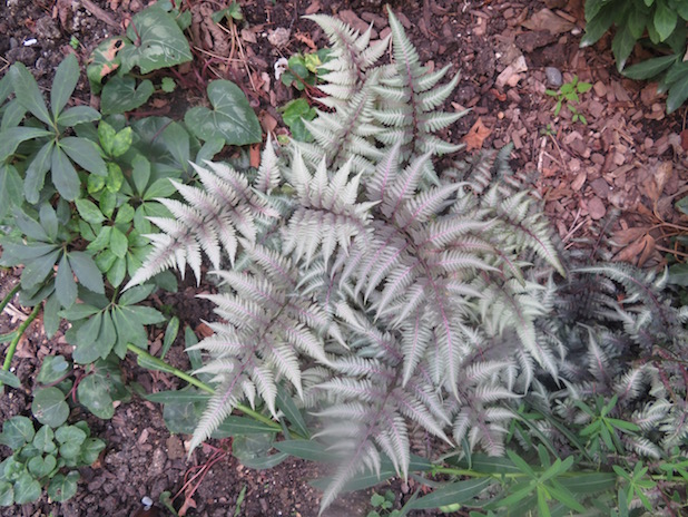 Athyrium niponicum ‘ pictum ‘, dans le jardin des Rosiers-Joseph Migneret, quartier du Marais, 4e.