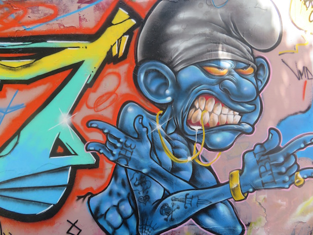 Schtroumpf rappeur sur le mur à fresques de la rue Ordener, quartier de la Goutte d’Or, 18e.