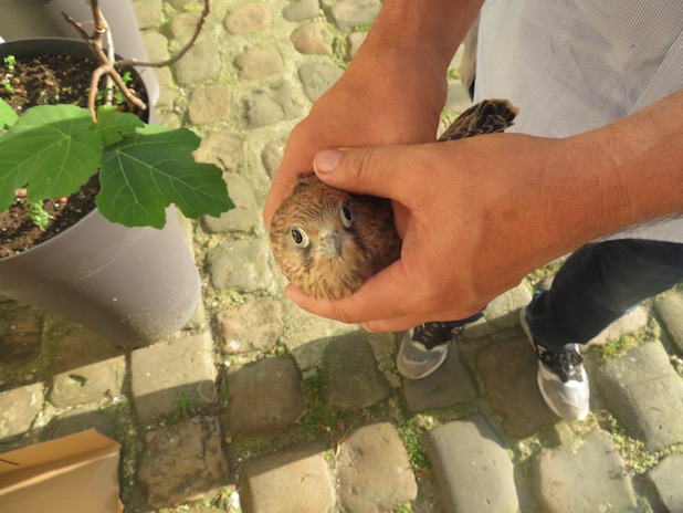 Sauvetage d’un jeune faucon crécerelle dans une cour du bd de la Chapelle, sur la Promenade urbaine, 19e.