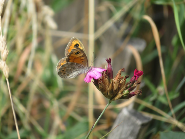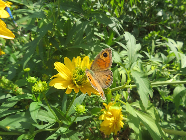 Némusien, Lasiommata maera, butinant dans un massif de plantes vivaces au jardin du Ranelagh, sur la boucle verte du 16e.