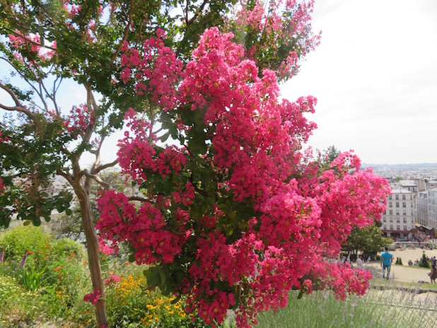 Lilas des Indes dans le jardin Louise Michel, quartier de Montmartre, 18e.