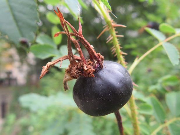 Fruit de rosier à feuille de pimprenelle, au jardin naturel, quartier de Charonne, 20e.
