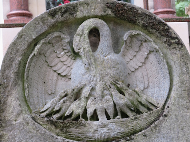 Pélican offrant son coeur à ses enfants, sur une tombe du cimetière du Père Lachaise, 20e.