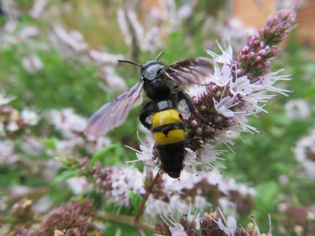 Scolie hirsute butinant une menthe dans le potager du parc de Bercy, 12e.