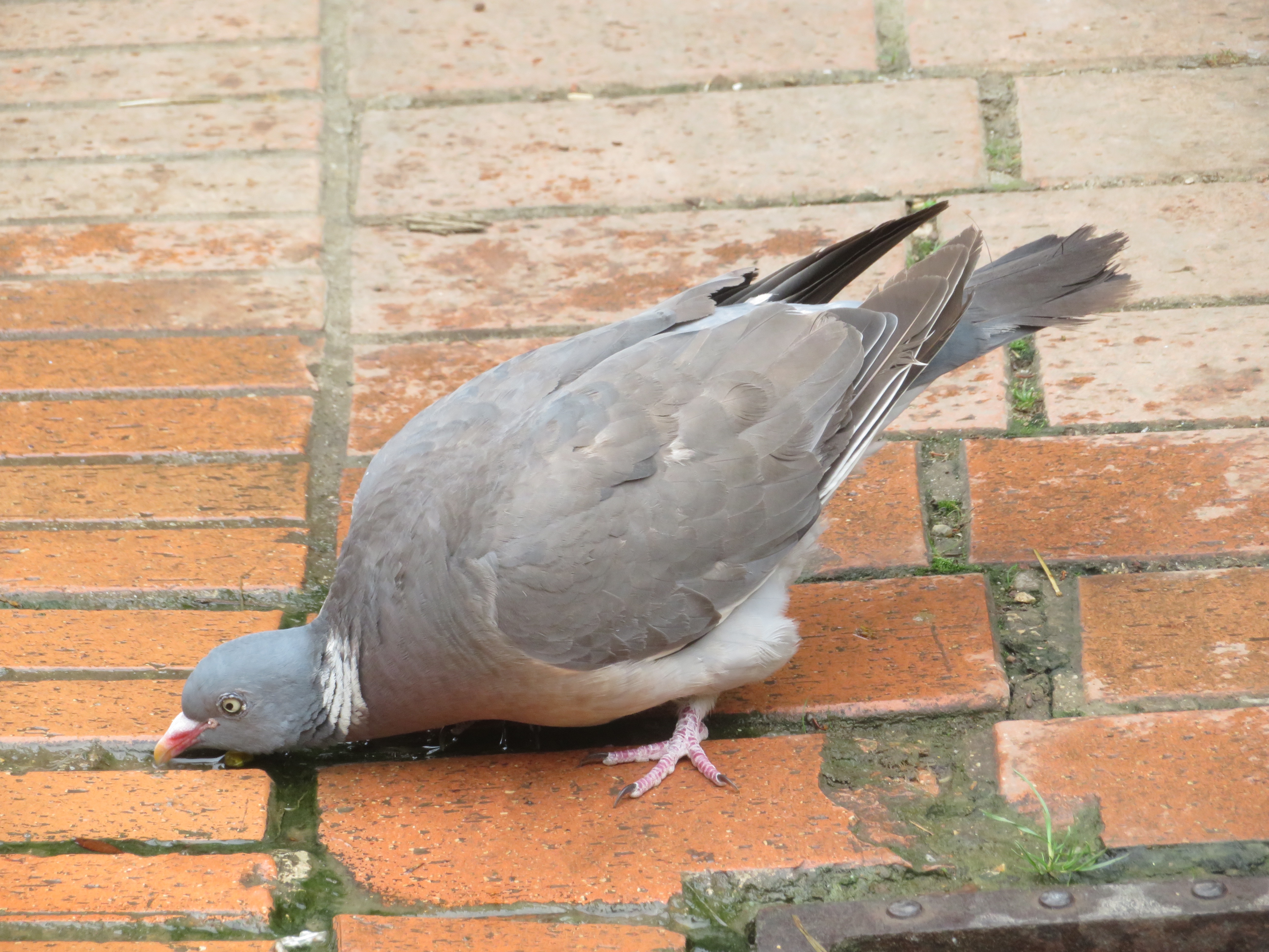 Pigeon ramier se désaltérant dans le potager du parc de Bercy, 12e.