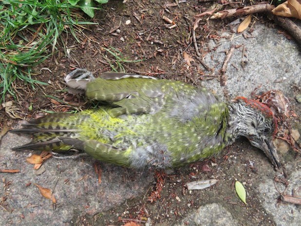 Pic vert juvénile, mort dans le parc de Bercy, 12e.