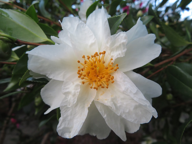 Camellia X vernalis ‘ star above star ‘, dans la pinède du parc floral, 12e.