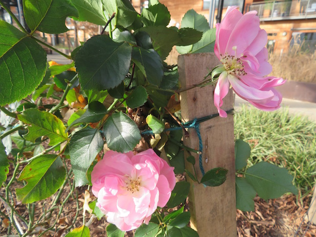 Roses précoces dans le jardin Rosa Luxemburg, quartier de la Chapelle, 18e.