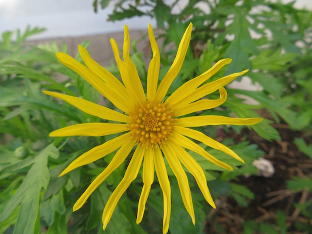 Inflorescence d’Euryops pectinatus, dans une cour du quartier de la Goutte d’Or, 18e.