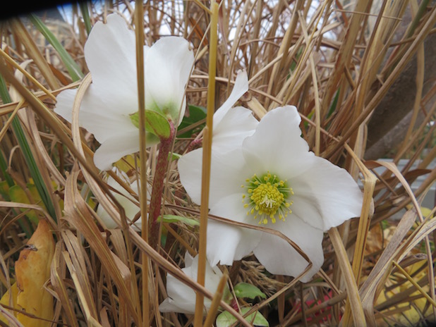Roses de Noël, Helleborus niger, en bac dans le jardin Nelson Mandela, Paris centre historique, 1er.