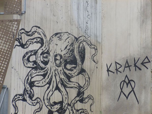 Kraken en goguette sur un mur du quartier du Marais, 4e.