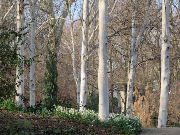 Petit chemin bordé de perce neiges dans le bosquet de bouleaux de l’Himalaya, au parc de Bercy, 12e.
