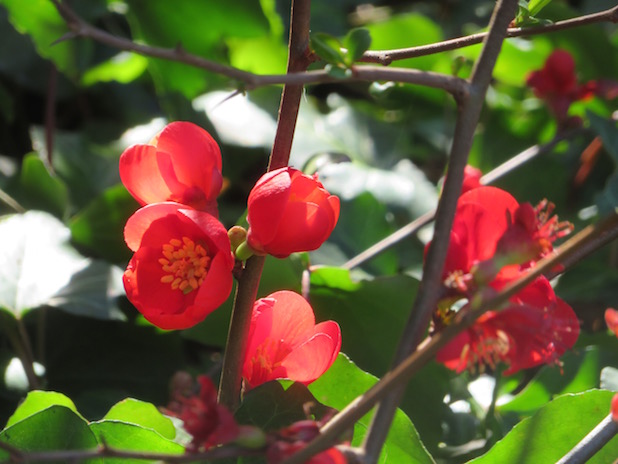 Cognassier du Japon en fleurs au parc André Citroën, 15e.