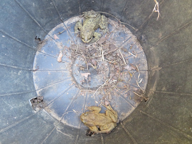 Crapauds communs acheminés chaque jour sur leur lieu de ponte pour leur éviter de traverser une route meurtrière, à l’arboretum de la Vallée aux Loups, 92.