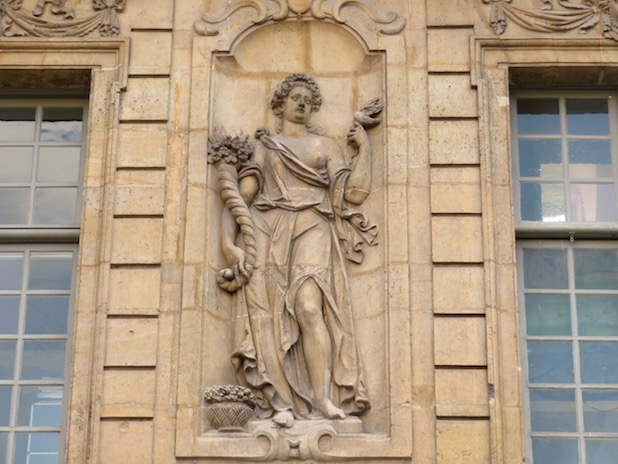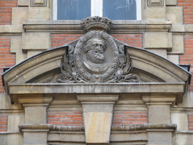 Effigie du Vert Galant sur le pavillon du Roi, côté sud de la place des Vosges qu’il a initié, quartier du Marais, 3e.