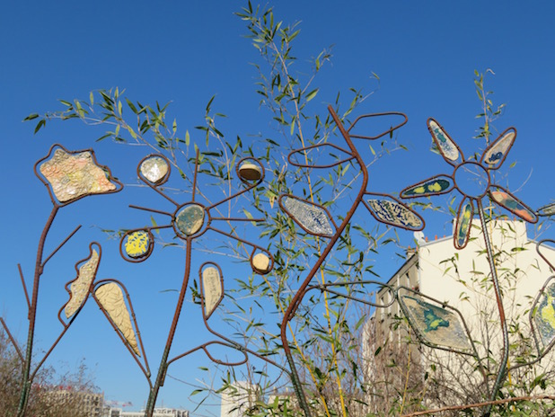 Fleurs métalliques au jardin partagé Ecobox, quartier de la Chapelle, 18e.