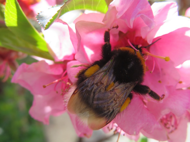 Bourdon terrestre butinant un pêcher près de la place de la Garenne, quartier de Plaisance, 14e.