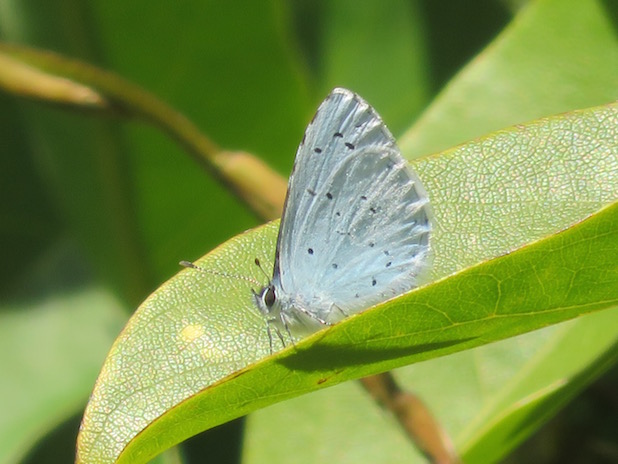 Azuré des nerpruns mâle, Celastrina argiolus, sur une feuille de Mucuna sempervirens, au jardin des serres d’Auteuil, 16e.