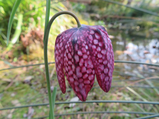 Fritillaire pintade près de la mare de la partie méditerranéenne du jardin des serres d’Auteuil, 16e.