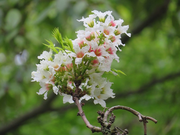 Meli-mélo entre Akebia quinata et Prunus padus ‘ coloratus ‘, au jardin de Bagatelle, 16e.
