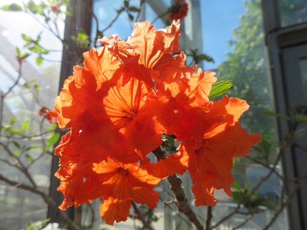 Inflorescence de Cordia sebestena, dans la serre contemporaine des Amériques, au jardin d’Auteuil, 16e.