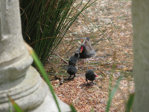 Gallinule poule d’eau et ses petits dans la » naumachie » du parc Monceau, 17e.