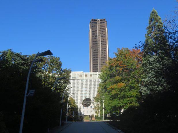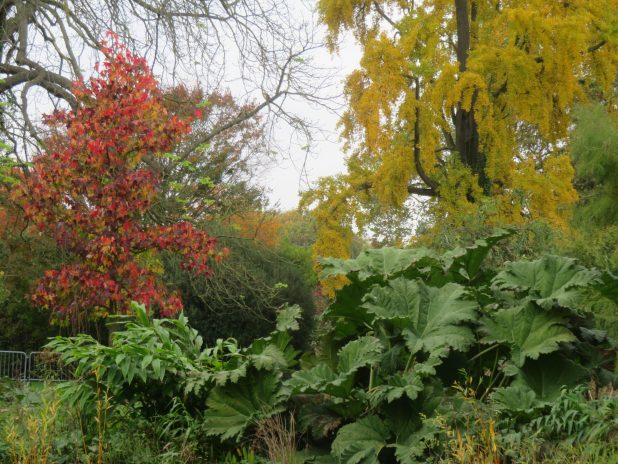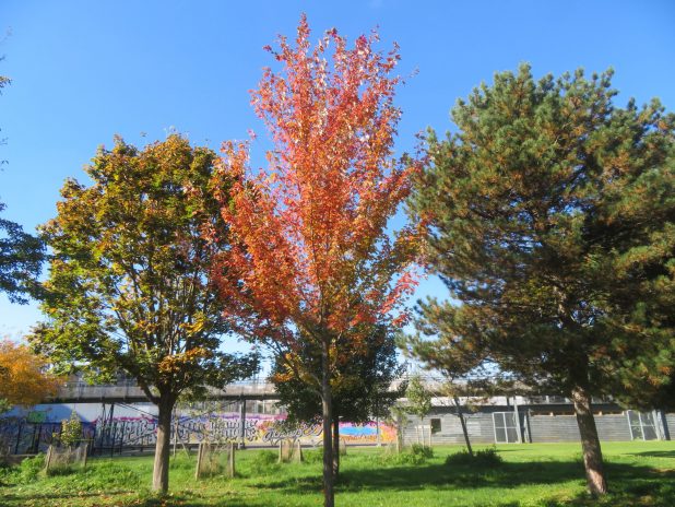 Scène automnale avec copalme, Liquidambar styracyflua, et Gingko biloba, à l’école du Breuil, 12e.