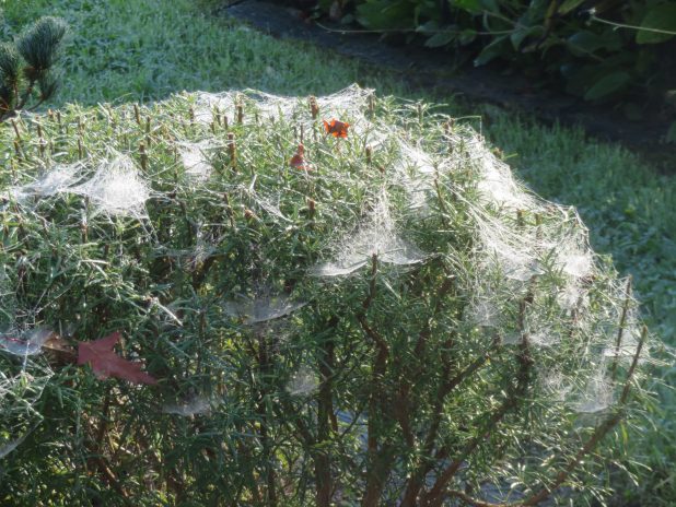 Romarin halloweenisé par des araignées, sur le parking de l’arboretum de la Vallée aux Loups, 92.