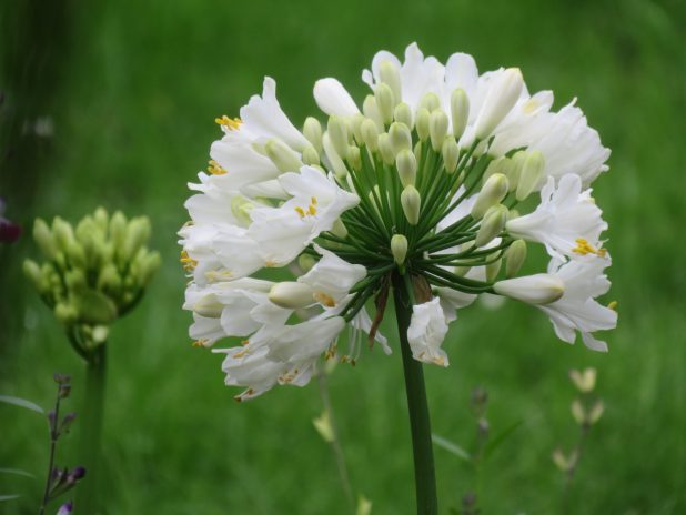 Jolie agapanthe blanche, Agapanthus sp, au jardin du Palais Royal, Paris centre historique.