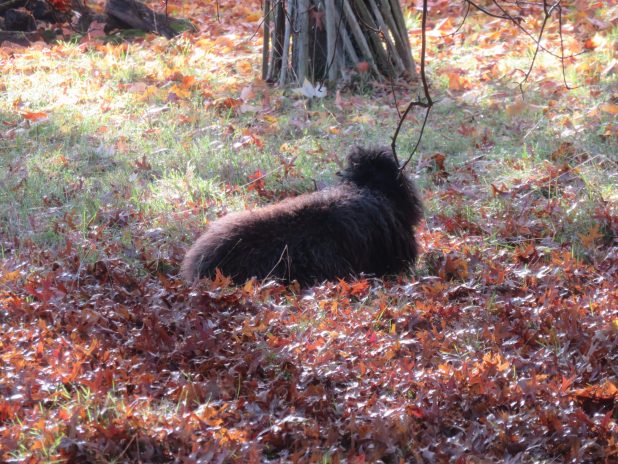 Repos matinal d’un mouton d’Ouessant, à l’arboretum de la Vallée aux Loups, 92.