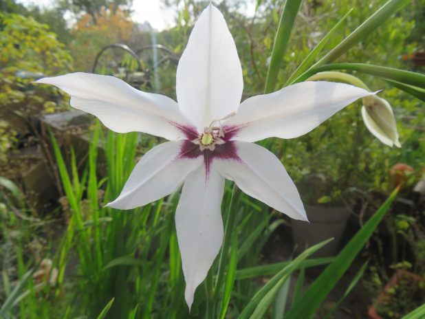 Glaieul d’Abyssinie au jardin partagé Ecobox, quartier de la Chapelle, 18e.