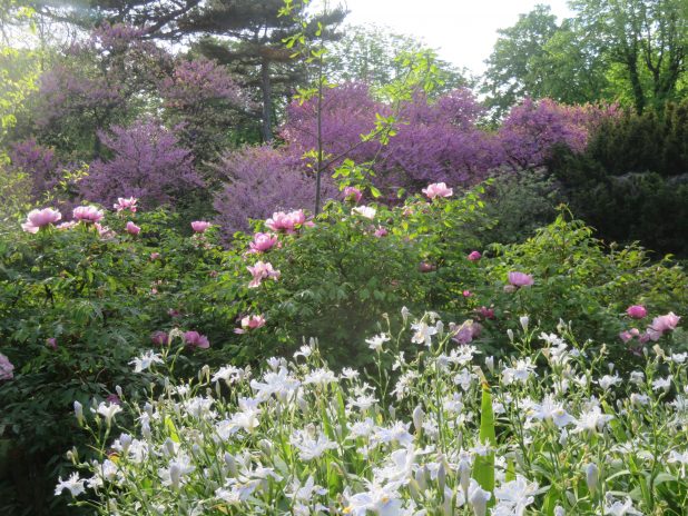 Pivoines arborescentes émergeant d’un tapis d’iris du Japon, sur fond d’arbre de Judée, au jardin des plantes, 5e.
