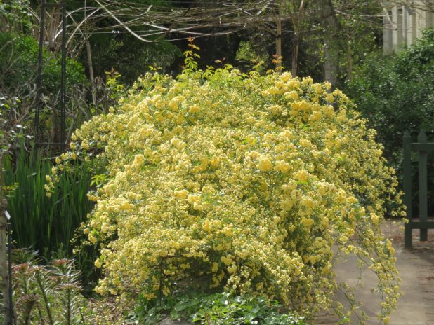Rosier fétide double, Rosa foetida ‘Persian Yellow’, pourvoyeur du pigment jaune chez les hybrides modernes. Au jardin alpin du jardin des plantes, 5e.