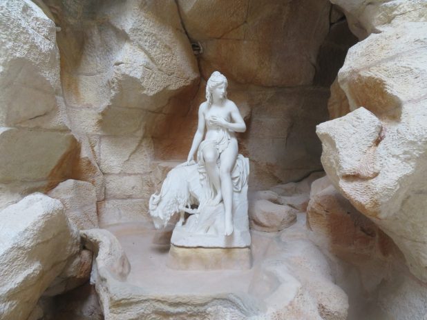 La nymphe Amalthée et la chèvre dont le lait a nourri Zeus enfant. Oeuvre de Pierre Julien, 1785, dans une grotte de pierre vergelé, à admirer dans la laiterie du château de Rambouillet, 78.