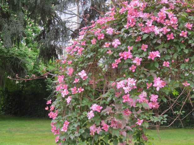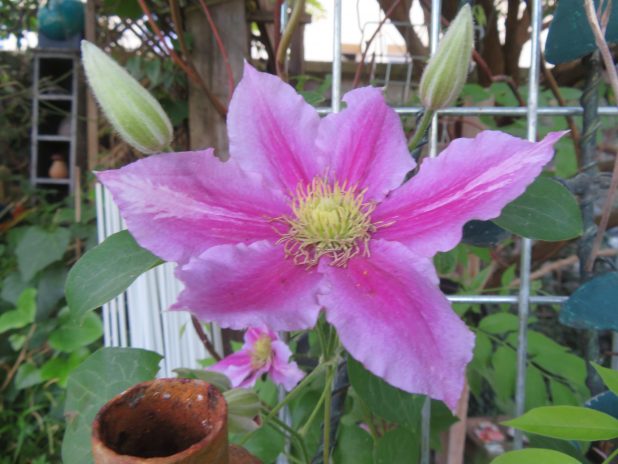 Clématite ‘ Nelly Moser ‘, au jardin partagé Ecobox, quartier de la Chapelle, 18e.