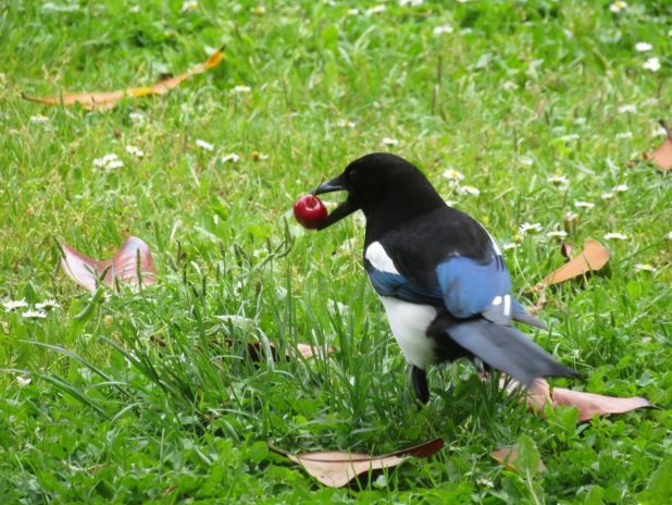 Pie gourmande s’éloignant avec la cerise que je lui ai offerte, au parc de l’Île st Germain, 92.