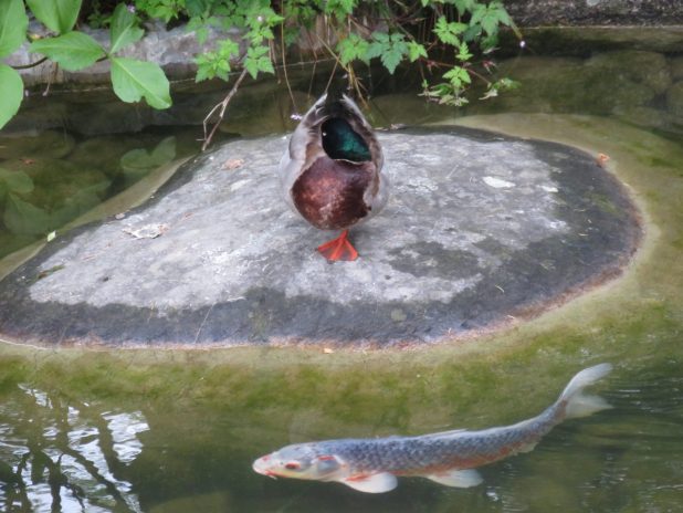 Canard colvert et carpe koï, à l’étang du jardin Albert Kahn, à Boulogne Billancourt, 92.