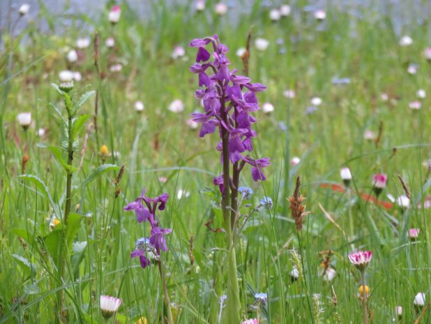 Orchidée mystère, probablement l’orchis bouffon, Anacamptis morio, au jardin du moulin de la Pointe, au cours de la balade dans le 13e.